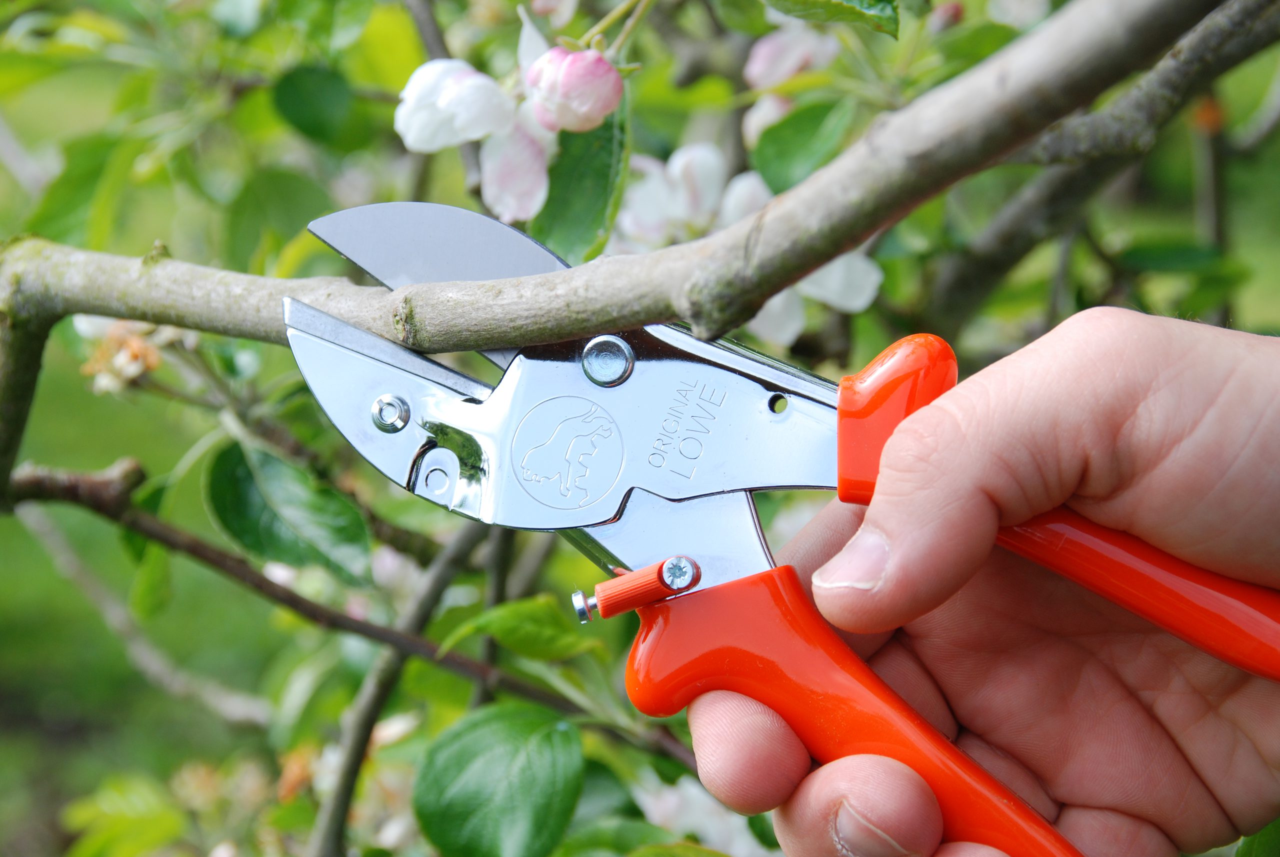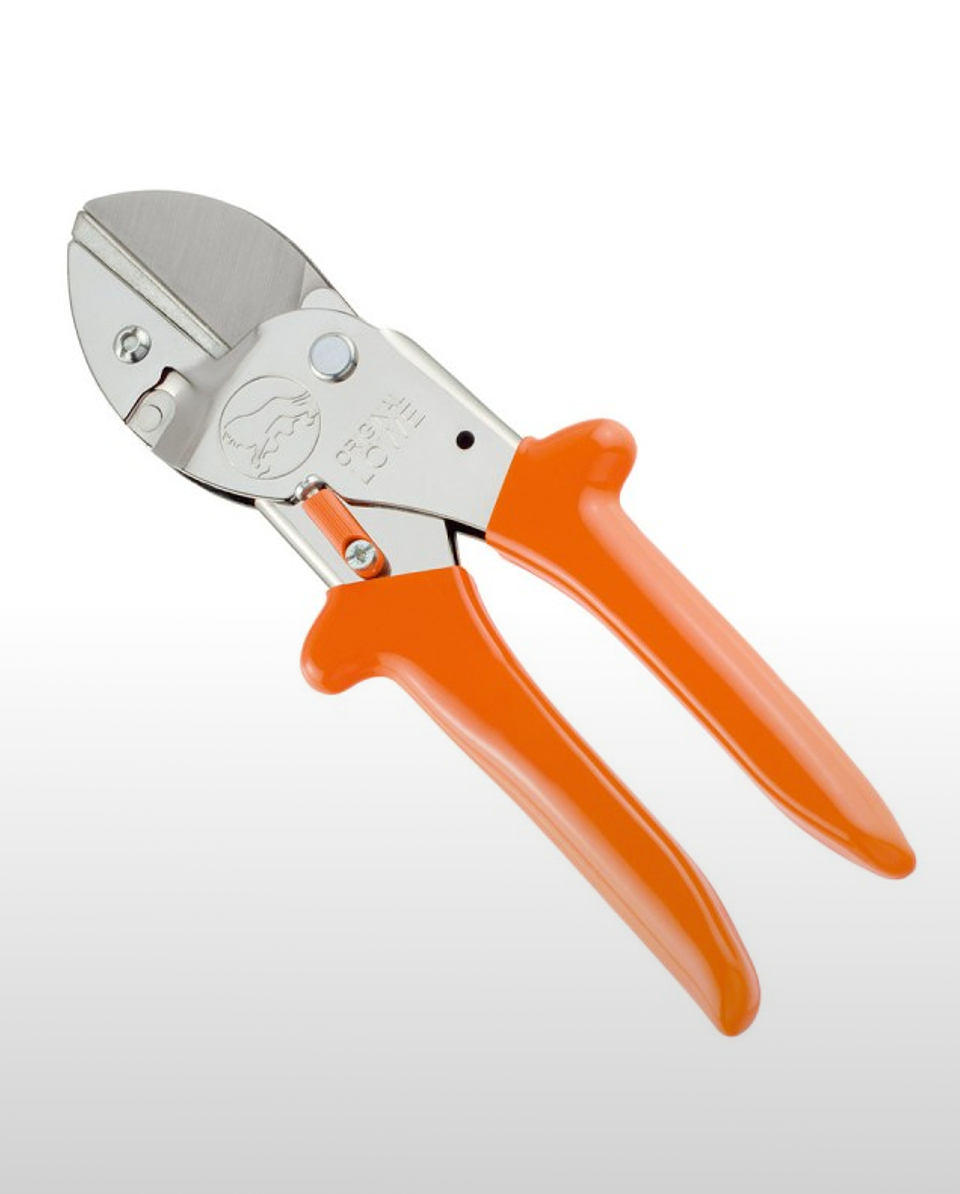 Kräftige Handschere in Ganzstahlausführung mit leichtem, ziehendem Schnitt gegen feststehenden Alu-Amboss.