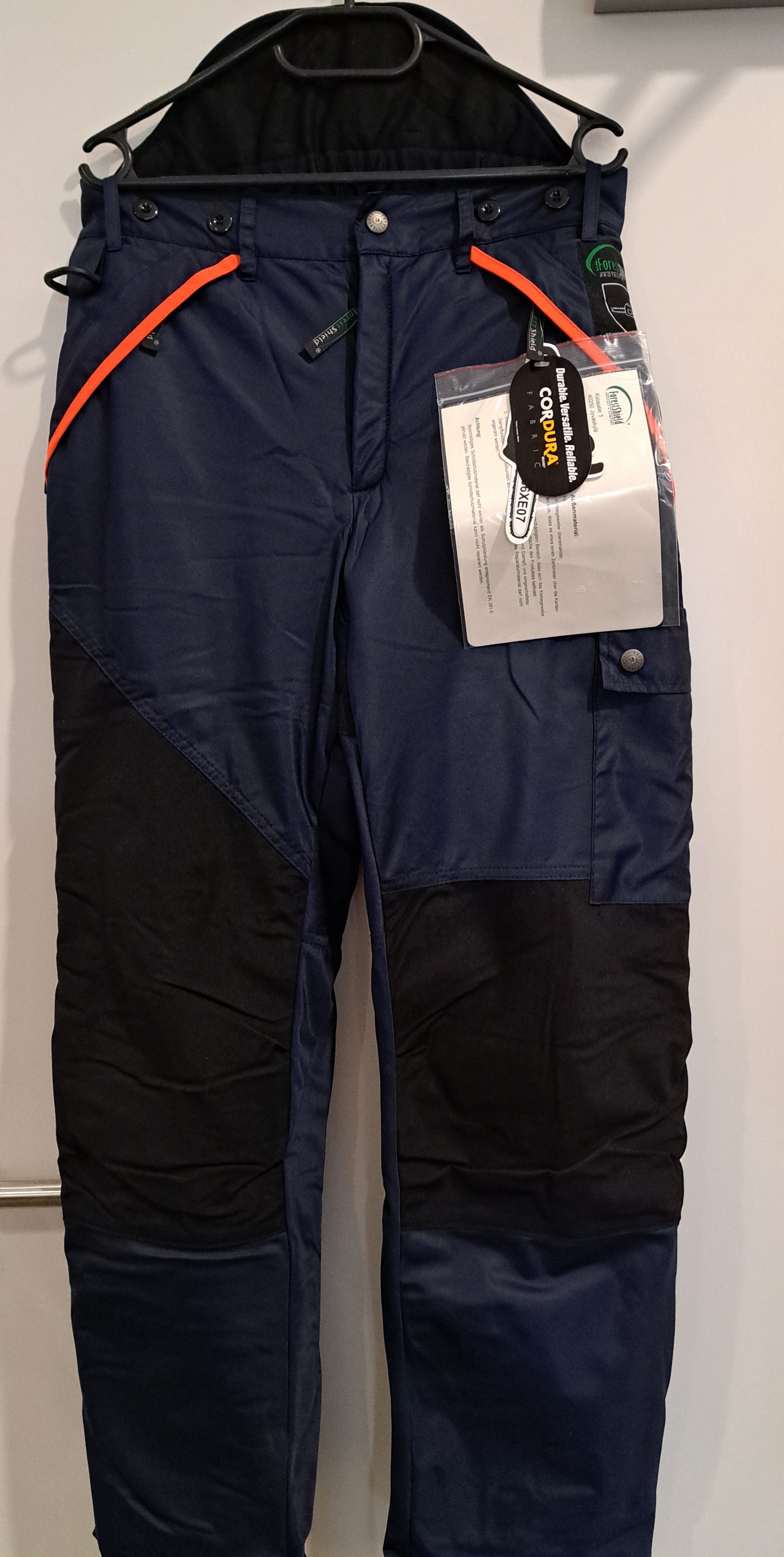 1 Gesäßtasche, 2 Vordertaschen mit Reißverschluß, 1 Beintasche