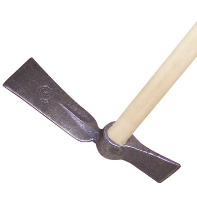 Geschmiedete Setz- und Pflanzhacke mit rundem Auge und 130 cm langen Eschenstiel.